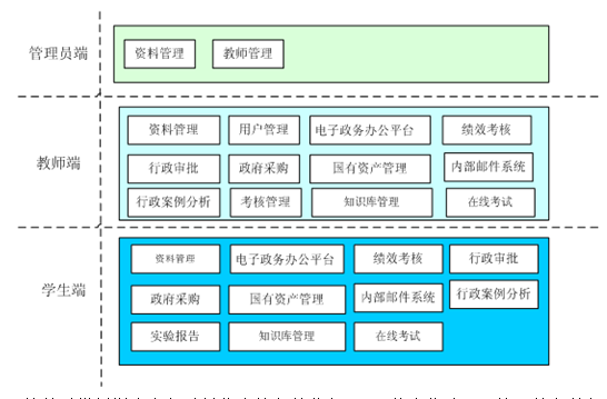 本教(jiao)(jiao)學(xue)(xue)平臺軟(ruan)件以模擬學(xue)(xue)生在行政(zheng)單位中的各種(zhong)業務,運用(yong)信息化建(jian)設環境下的各種(zhong)角色、功(gong)能(neng)配置,以各業務關(guan)(guan)系和(he)流程(cheng)作為主要實(shi)(shi)踐教(jiao)(jiao)學(xue)(xue)的手(shou)段,配以教(jiao)(jiao)師(shi)強大的后(hou)臺管理功(gong)能(neng)和(he)教(jiao)(jiao)學(xue)(xue)工具,滿足(zu)電子政(zheng)務及相關(guan)(guan)學(xue)(xue)科的教(jiao)(jiao)師(shi)運用(yong)現代化教(jiao)(jiao)學(xue)(xue)工具開展網絡教(jiao)(jiao)學(xue)(xue)和(he)實(shi)(shi)踐教(jiao)(jiao)學(xue)(xue)的要求。