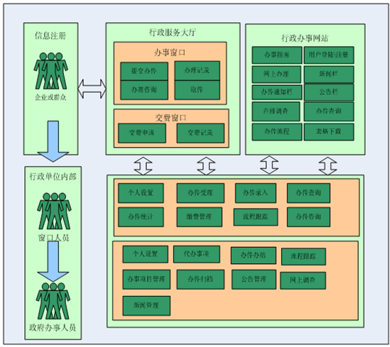 門戶網站(zhan)(zhan)(zhan):面向社會大(da)眾,為(wei)群眾、團體(ti)、企業(ye)提供一站(zhan)(zhan)(zhan)式(shi)的服(fu)(fu)務(wu)平(ping)臺。有(you)辦事需求的個人、企業(ye)、團體(ti)通過網站(zhan)(zhan)(zhan)注冊為(wei)各類用戶,瀏覽(lan)辦事流程,根(gen)據流程需要提交(jiao)相關文件(jian),并可以(yi)隨時查(cha)看(kan)每一步(bu)流程的審(shen)批結果(guo)。除此之外,還可以(yi)通過網站(zhan)(zhan)(zhan)瀏覽(lan)政(zheng)府的新聞、公(gong)告,查(cha)詢各種服(fu)(fu)務(wu)信息等。