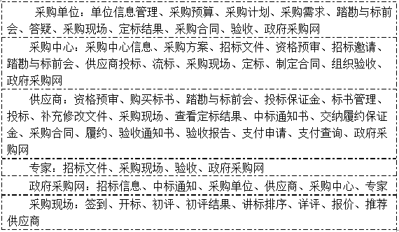 采(cai)(cai)購(gou)活動由(you)采(cai)(cai)購(gou)單位發起,根據采(cai)(cai)購(gou)目錄(lu)制定(ding)采(cai)(cai)購(gou)預算、采(cai)(cai)購(gou)計(ji)劃(hua)、采(cai)(cai)購(gou)需求(qiu)建立采(cai)(cai)購(gou)任務。由(you)采(cai)(cai)購(gou)中心組(zu)織(zhi)并(bing)發布采(cai)(cai)購(gou)信(xin)息(xi),供應商通過采(cai)(cai)購(gou)信(xin)息(xi)前(qian)來購(gou)買(mai)標書(shu)、制作采(cai)(cai)購(gou)響(xiang)應文件、投遞標書(shu)、交(jiao)(jiao)納保證金、參加標前(qian)會和踏勘、開標前(qian)提交(jiao)(jiao)質疑文件。