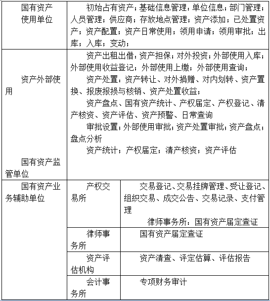 在業(ye)務流程中,由包含(han)著(zhu)資(zi)產(chan)盤點;資(zi)產(chan)統計;產(chan)權登記及(ji)變(bian)更(geng)、年檢;產(chan)權屆(jie)定;清產(chan)核(he)資(zi);資(zi)產(chan)評(ping)估;資(zi)產(chan)收益管理等。