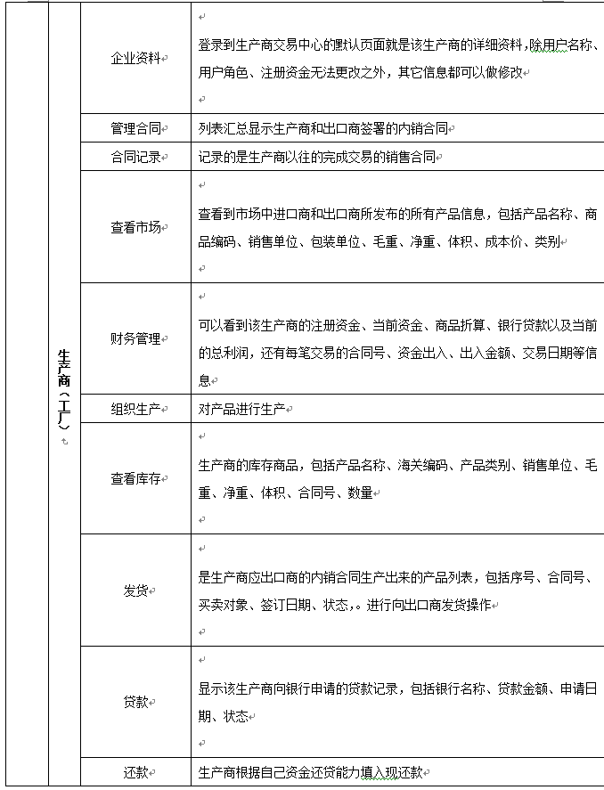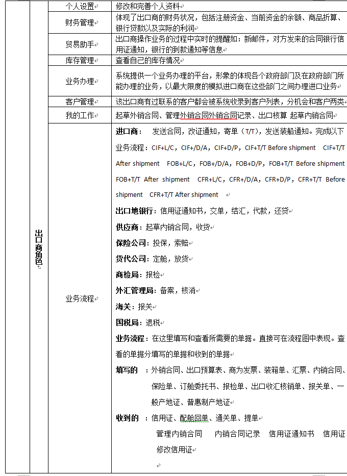 7、可(ke)以配置進(jin)口(kou)(kou)(kou)商(shang)、出口(kou)(kou)(kou)商(shang)、進(jin)口(kou)(kou)(kou)地銀行、出口(kou)(kou)(kou)地銀行、國(guo)稅(shui)局(ju)、海關、商(shang)檢局(ju)、保險公司、貨代公司、外(wai)匯(hui)管(guan)理局(ju)等(deng)相關參(can)數(shu)和(he)業(ye)務,在(zai)實訓過程中可(ke)以分組、分角色進(jin)行互動、交互式訓練。角色扮演(yan):出口(kou)(kou)(kou)商(shang)、進(jin)口(kou)(kou)(kou)商(shang)、生產商(shang)(工廠)、進(jin)口(kou)(kou)(kou)銀行、出口(kou)(kou)(kou)銀行、保險公司、商(shang)檢局(ju)、海關、外(wai)匯(hui)管(guan)理局(ju)、貨代、國(guo)稅(shui)局(ju)