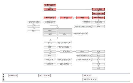 收到的:信(xin)用證(zheng)、配艙回(hui)單(dan)、通(tong)關單(dan)、提單(dan)管理內(nei)銷合同(tong) 內(nei)銷合同(tong)記(ji)錄信(xin)用證(zheng)通(tong)知(zhi)書(shu) 信(xin)用證(zheng) 修改信(xin)用證(zheng)。