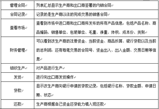 教(jiao)師(shi)為(wei)參(can)加(jia)實(shi)(shi)習的(de)學(xue)生分(fen)配(pei)角(jiao)色(se),設定實(shi)(shi)習評分(fen)標(biao)準、實(shi)(shi)時監控(kong)學(xue)生的(de)操作,并且對于模擬貿(mao)易(yi)中(zhong)發(fa)生的(de)糾紛(fen)進行(xing)仲(zhong)裁,最(zui)終(zhong)利用(yong)評分(fen)系統對學(xue)生的(de)實(shi)(shi)習成果給(gei)予評定,教(jiao)師(shi)通(tong)過在(zai)網站發(fa)布新(xin)聞、調整商(shang)品成本和價格、調整匯率、業務費(fei)用(yong)、海運費(fei)、保險費(fei)率及突(tu)發(fa)事(shi)件的(de)發(fa)生概率等方式對國際貿(mao)易(yi)環境(jing)實(shi)(shi)施宏觀調控(kong),讓學(xue)生在(zai)實(shi)(shi)習中(zhong)充分(fen)發(fa)揮主觀能動性