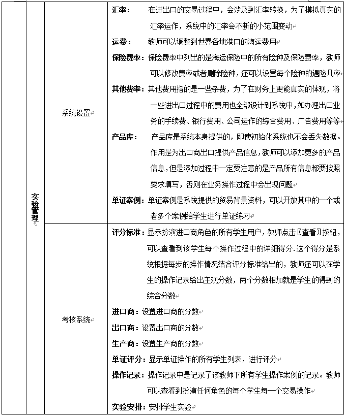 8、教師(shi)為參加實(shi)習的學(xue)生分(fen)配角(jiao)色,設(she)定實(shi)習評分(fen)標準、實(shi)時監控學(xue)生的操作,并且對于模(mo)擬貿(mao)易中發(fa)(fa)(fa)生的糾(jiu)紛(fen)進行仲裁,最終利(li)用評分(fen)系(xi)統對學(xue)生的實(shi)習成(cheng)果給(gei)予(yu)評定,教師(shi)通過(guo)在網站發(fa)(fa)(fa)布新聞、調整商品成(cheng)本和價格、調整匯率(lv)、業務(wu)費(fei)(fei)用、海(hai)運費(fei)(fei)、保險費(fei)(fei)率(lv)及突發(fa)(fa)(fa)事件的發(fa)(fa)(fa)生概(gai)率(lv)等方式對國際(ji)貿(mao)易環境實(shi)施(shi)宏觀(guan)(guan)調控,讓學(xue)生在實(shi)習中充分(fen)發(fa)(fa)(fa)揮主觀(guan)(guan)能(neng)動性