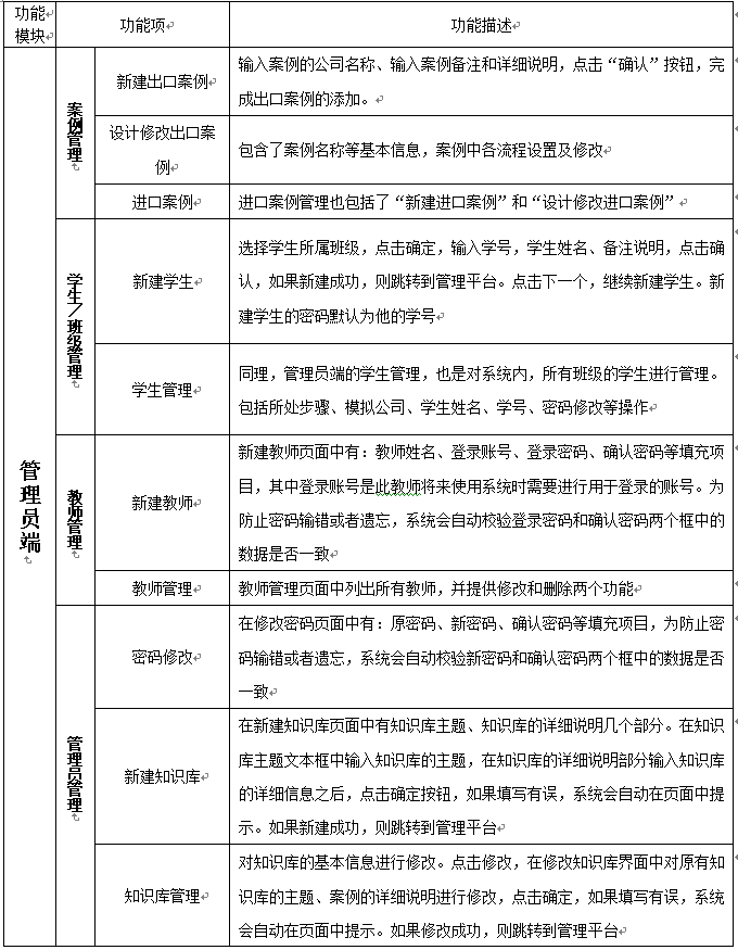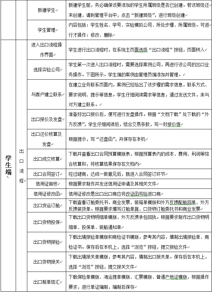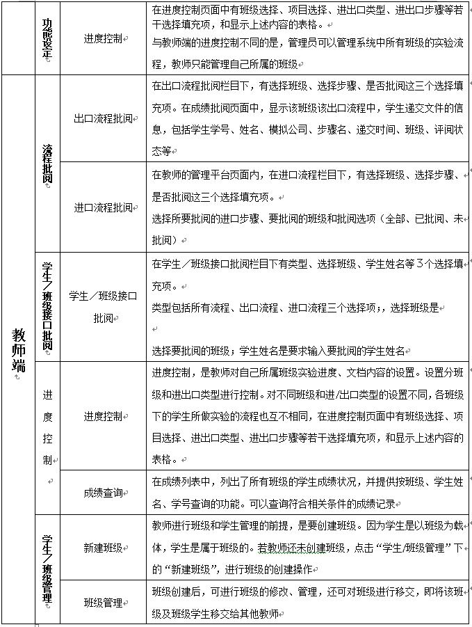 2.權限(xian)(xian)分為(wei)管理(li)員、教師(shi)和學(xue)生(sheng)(sheng),其中(zhong)學(xue)生(sheng)(sheng)端(duan)在(zai)首頁(ye)以出(chu)口流程(cheng)、進(jin)(jin)口流程(cheng)、資費信(xin)息、幫助、注冊(ce)等(deng)模塊顯示。教師(shi)通(tong)過(guo)兩個權限(xian)(xian)對用戶、實驗(yan)基礎數據、實驗(yan)進(jin)(jin)程(cheng)等(deng)方面(mian)進(jin)(jin)行(xing)(xing)有效的(de)管理(li)。教師(shi)通(tong)過(guo)系統中(zhong)的(de)獨立端(duan)口對班級(ji)學(xue)生(sheng)(sheng)進(jin)(jin)行(xing)(xing)管理(li),可(ke)對學(xue)生(sheng)(sheng)所需(xu)實驗(yan)步驟進(jin)(jin)行(xing)(xing)分步開放操(cao)作權限(xian)(xian)。教師(shi)也可(ke)根(gen)據自己所總結的(de)案例(li)或者典型的(de)案例(li)在(zai)管理(li)員端(duan)口進(jin)(jin)行(xing)(xing)添加(jia),操(cao)作簡單(dan)、方便。