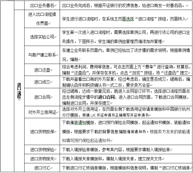 4.進(jin)口(kou)流(liu)程包含選擇實驗公司(si)、與客戶建立(li)聯系、出(chu)(chu)口(kou)報價及發(fa)盤(pan)、出(chu)(chu)口(kou)還價核(he)算及發(fa)盤(pan)、出(chu)(chu)口(kou)成(cheng)交核(he)算、出(chu)(chu)口(kou)合(he)同簽訂(ding)、信用(yong)證審核(he)、信用(yong)證修改函、出(chu)(chu)口(kou)貨運訂(ding)艙、出(chu)(chu)口(kou)貨物(wu)投(tou)保、出(chu)(chu)口(kou)貨物(wu)報檢、出(chu)(chu)口(kou)貨物(wu)報關(guan)、出(chu)(chu)口(kou)制單結匯(hui)和(he)(he)出(chu)(chu)口(kou)業(ye)務善后等內(nei)容。軟件內(nei)容注重(zhong)實務操(cao)作,它針對外貿業(ye)務的(de)實踐性和(he)(he)適時(shi)性,通(tong)過各種案(an)例(li)加深對國際貿易(yi)各種慣例(li)及法律法規(gui)、業(ye)務規(gui)范的(de)理解和(he)(he)記憶。