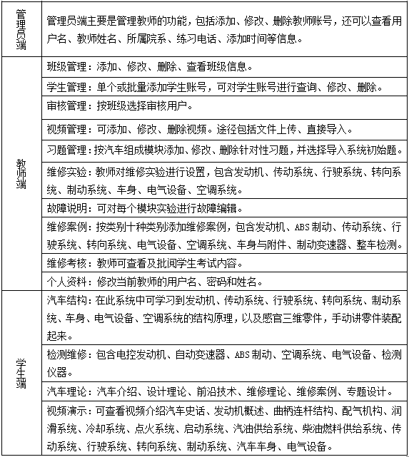 汽(qi)(qi)車結(jie)構(gou)考核(he)部分(fen)的(de)(de)核(he)心內容是汽(qi)(qi)車知識、汽(qi)(qi)車案例以及在線考試系統(tong),學(xue)(xue)生(sheng)通過汽(qi)(qi)車理(li)論知識和案例的(de)(de)學(xue)(xue)習,可(ke)以豐富平(ping)時的(de)(de)理(li)論基礎,同時,在線考試的(de)(de)應用,為教師和學(xue)(xue)生(sheng)提供方便的(de)(de)模擬考試平(ping)臺,既達(da)到考核(he)學(xue)(xue)生(sheng)對知識的(de)(de)掌握情況,又可(ke)以提高教學(xue)(xue)效(xiao)率
