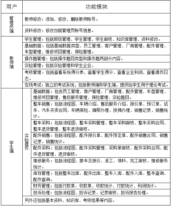 根據汽車(che)(che)(che)4S店的管(guan)(guan)理(li)(li)模式設計(ji)整車(che)(che)(che)、汽配、維(wei)修服(fu)務三方(fang)面的業務管(guan)(guan)理(li)(li)和客戶(hu)投訴處(chu)理(li)(li),以(yi)及相關的庫(ku)存管(guan)(guan)理(li)(li)、整車(che)(che)(che)配件采(cai)購、財務管(guan)(guan)理(li)(li)。軟件中不僅包含豐富的實訓內容,還(huan)獨立(li)知識庫(ku)單(dan)元,拓(tuo)展學生(sheng)的汽車(che)(che)(che)服(fu)務相關知識。