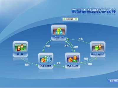 系統(tong)是(shi)通(tong)過對(dui)共用數據的(de)(de)采(cai)集,為(wei)學(xue)(xue)(xue)校的(de)(de)物流(liu)(liu)教(jiao)(jiao)學(xue)(xue)(xue)信息提(ti)供基礎支(zhi)撐信息,滿足學(xue)(xue)(xue)校對(dui)供應(ying)鏈對(dui)物流(liu)(liu)的(de)(de)教(jiao)(jiao)學(xue)(xue)(xue)需求,支(zhi)撐物流(liu)(liu)教(jiao)(jiao)學(xue)(xue)(xue)中各種功(gong)能(neng)(neng)的(de)(de)實現;同(tong)時通(tong)過共享(xiang)信息支(zhi)撐學(xue)(xue)(xue)生(sheng)在(zai)實驗(yan)室、在(zai)家、在(zai)任何地點的(de)(de)學(xue)(xue)(xue)習。系統(tong)除了(le)強大的(de)(de)原(yuan)材料供應(ying)商(shang)(shang)-供應(ying)商(shang)(shang)-經銷商(shang)(shang)-物流(liu)(liu)公司-客戶(hu)的(de)(de)處(chu)理(li)能(neng)(neng)力以外,還(huan)具有后臺的(de)(de)班級管(guan)(guan)(guan)理(li)、學(xue)(xue)(xue)生(sheng)管(guan)(guan)(guan)理(li)、知識(shi)庫管(guan)(guan)(guan)理(li)、題庫管(guan)(guan)(guan)理(li)、考試管(guan)(guan)(guan)理(li)、試卷管(guan)(guan)(guan)、師(shi)生(sheng)交流(liu)(liu)管(guan)(guan)(guan)理(li)、經營分析等功(gong)能(neng)(neng),使教(jiao)(jiao)師(shi)利用此系統(tong)輕松(song)進行(xing)知識(shi)傳授、考試、師(shi)生(sheng)知識(shi)溝(gou)通(tong)。