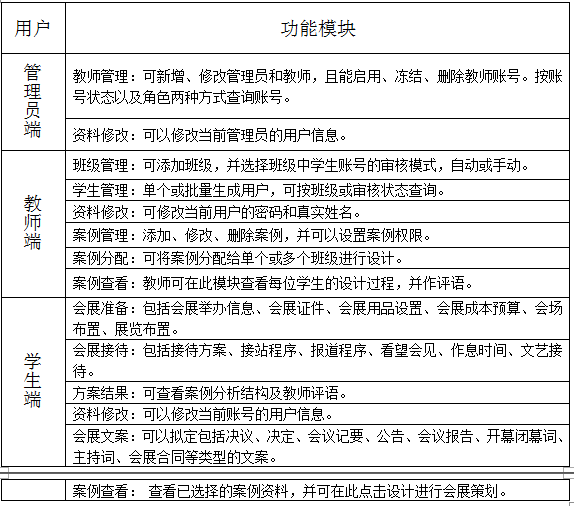 系(xi)(xi)統(tong)內置幾(ji)十條國內外會(hui)展案例信息,包(bao)括(kuo)柏林國際(ji)(ji)水果(guo)蔬菜博(bo)覽(lan)(lan)會(hui)、廣州國際(ji)(ji)節能展覽(lan)(lan)會(hui)、華南國際(ji)(ji)名酒名茶展覽(lan)(lan)會(hui)、中(zhong)國環(huan)保博(bo)覽(lan)(lan)會(hui)、中(zhong)國國際(ji)(ji)機電工業博(bo)覽(lan)(lan)會(hui)等。系(xi)(xi)統(tong)還(huan)提供開放(fang)式的(de)案例添加端口,教師可按自己的(de)授課方式添加最新的(de)案例。