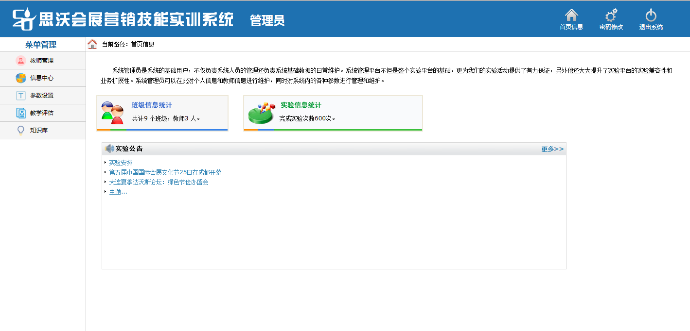管理員(yuan)包含(教室(shi)管理,信(xin)息中心,參數設置,教學評估,知(zhi)識庫等(deng)模塊(kuai))