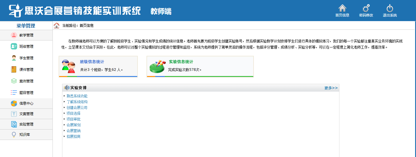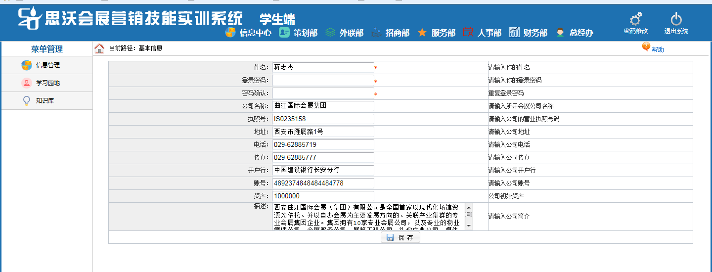 思(si)沃會展(zhan)(zhan)(zhan)(zhan)營(ying)銷模擬(ni)實(shi)(shi)訓系統以(yi)(yi)模擬(ni)會展(zhan)(zhan)(zhan)(zhan)公司的(de)(de)(de)策(ce)劃部(bu)(bu)(bu)、外聯部(bu)(bu)(bu)、招商部(bu)(bu)(bu)、會展(zhan)(zhan)(zhan)(zhan)服務(wu)(wu)部(bu)(bu)(bu)、人事(shi)部(bu)(bu)(bu)、財(cai)務(wu)(wu)部(bu)(bu)(bu)以(yi)(yi)及(ji)總經辦7大業(ye)務(wu)(wu)部(bu)(bu)(bu)門為(wei)基礎而展(zhan)(zhan)(zhan)(zhan)開(kai)實(shi)(shi)驗(yan)操(cao)作(zuo)(zuo)的(de)(de)(de)。該教(jiao)學(xue)平臺(tai)軟件業(ye)務(wu)(wu)內容包括了:項(xiang)目上(shang)報審批、項(xiang)目的(de)(de)(de)策(ce)劃安排、服務(wu)(wu)商管(guan)理(li)、人事(shi)招聘(pin)與管(guan)理(li)、會展(zhan)(zhan)(zhan)(zhan)的(de)(de)(de)現(xian)場服務(wu)(wu)與合(he)同管(guan)理(li)等等,讓(rang)學(xue)生(sheng)通過(guo)實(shi)(shi)驗(yan)感受會展(zhan)(zhan)(zhan)(zhan)項(xiang)目的(de)(de)(de)系統化管(guan)理(li)流程與業(ye)務(wu)(wu)操(cao)作(zuo)(zuo)內容,不但能夠了解(jie)會展(zhan)(zhan)(zhan)(zhan)項(xiang)目從立項(xiang)審批到策(ce)劃、宣傳、招展(zhan)(zhan)(zhan)(zhan)招商、現(xian)場服務(wu)(wu)以(yi)(yi)及(ji)會后總結各(ge)個(ge)環節(jie)的(de)(de)(de)業(ye)務(wu)(wu),同時還可以(yi)(yi)掌握各(ge)種文案的(de)(de)(de)寫作(zuo)(zuo)技巧(qiao),從而讓(rang)學(xue)生(sheng)真(zhen)正的(de)(de)(de)理(li)解(jie)并掌握會展(zhan)(zhan)(zhan)(zhan)這一行(xing)業(ye)的(de)(de)(de)各(ge)種知識(shi)與業(ye)務(wu)(wu)要求。為(wei)學(xue)生(sheng)以(yi)(yi)后的(de)(de)(de)工作(zuo)(zuo)、學(xue)習提供(gong)了一個(ge)實(shi)(shi)戰(zhan)演練的(de)(de)(de)實(shi)(shi)訓平臺(tai),增強了學(xue)生(sheng)進入工作(zuo)(zuo)崗位后的(de)(de)(de)實(shi)(shi)力。